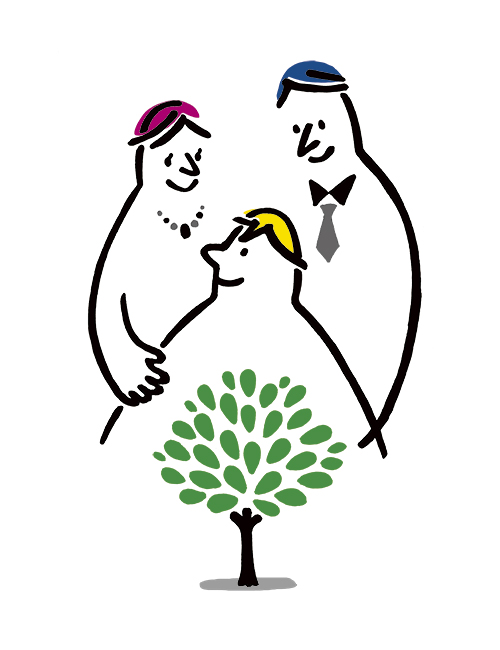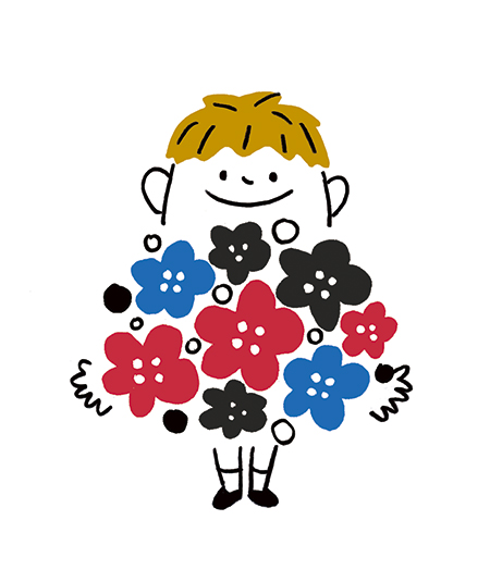 はっきりとした線とカラフルな色で着色された男の子のイラスト。子供がたくさんのお花をかかえている はっきりとした線とカラフルな色で着色された親子のイラスト。シンプルな線で描かれた父、母、子どもが微笑みあっている。前には成長を意味する木