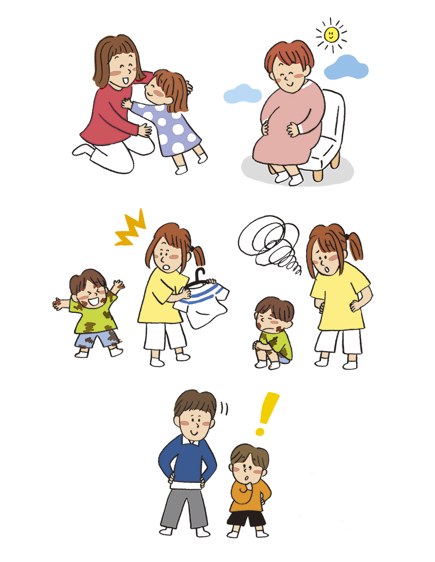 はっきりとした線とカラフルな色で着色された親子のイラスト。かわいい親と子供、妊娠した妊婦さん、子育てに奮闘するお母さん、何かに気づく男の子とお父さん。