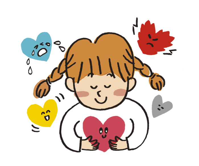 シンプルな線とはっきりとした色で描かれた自然の野生の動物のイラスト。木の上にいるリスが枝を咥えている シンプルな線とはっきりとした色で描かれた子どものイラスト。女の子とハートの心がいっぱい。精神をイメージ