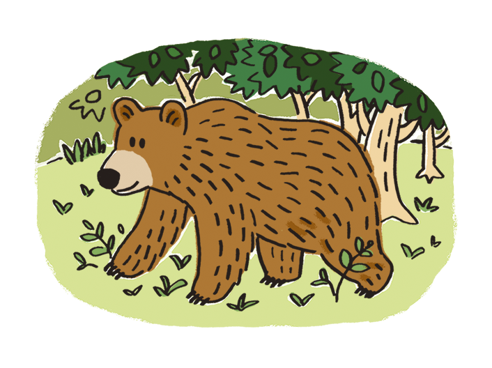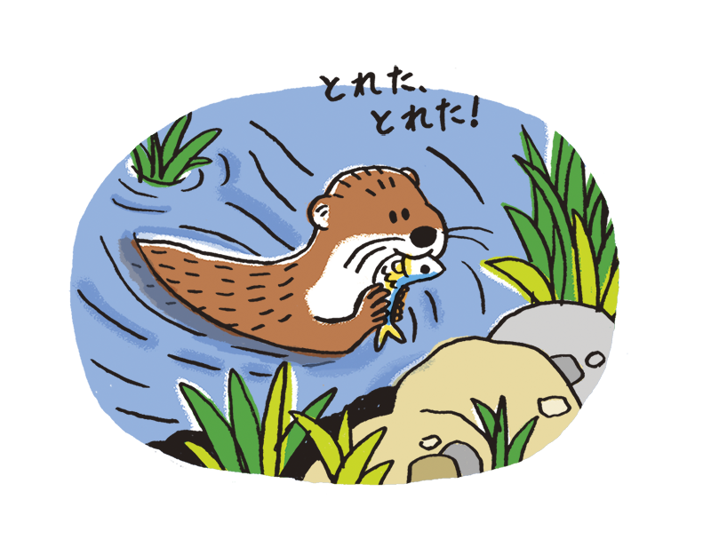 シンプルな線とはっきりとした色で描かれた自然の野生の動物のイラスト。川でカワウソが魚をとっている シンプルな線とはっきりとした色で描かれた自然の野生の動物のイラスト。熊が森で歩いている