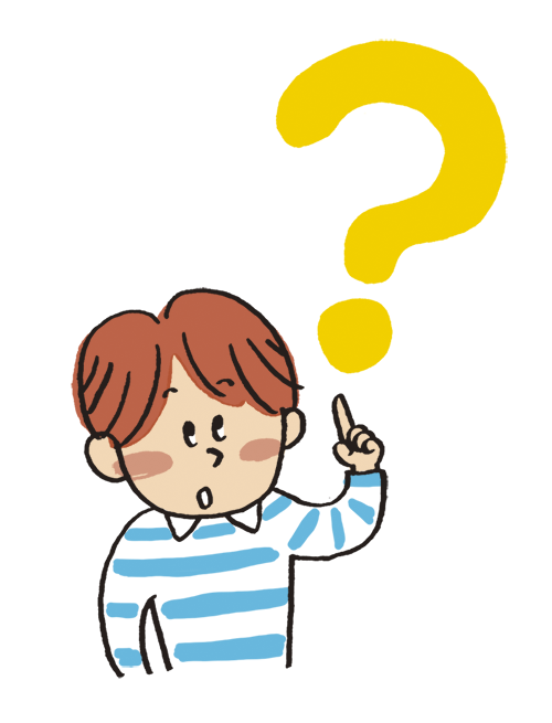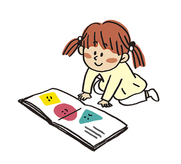 シンプルな線とはっきりとした色で描かれた子どものイラスト。男の子が何かひらめいた。大きなクエスチョン シンプルな線とはっきりとした色で描かれた子どものイラスト。女の子が絵本を読んでいる