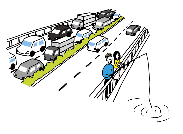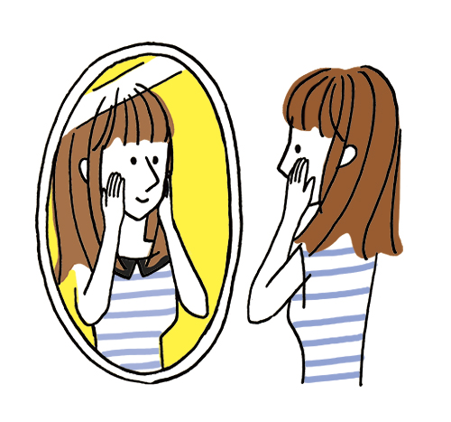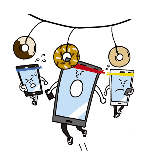 はっきりとした線とカラフルな色で着色された女性のイラスト。女の子が鏡に映った自分を見ている  はっきりとした線とカラフルな色で着色された障害物競走のイラスト。携帯電話がぶらさがったドーナツに食いつこうとしている