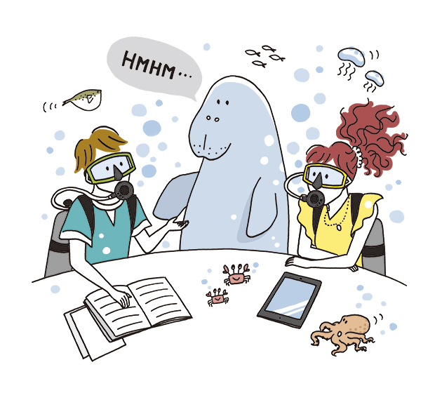 はっきりとした線とカラフルな色で着色されたイラスト。男性と女性が酸素ボンベを背負って、水中でジュゴンと環境について会議している はっきりとした線とカラフルな色で着色されたイラスト。男性と女性が酸素ボンベを背負って、水中でジュゴンと環境について会議している
