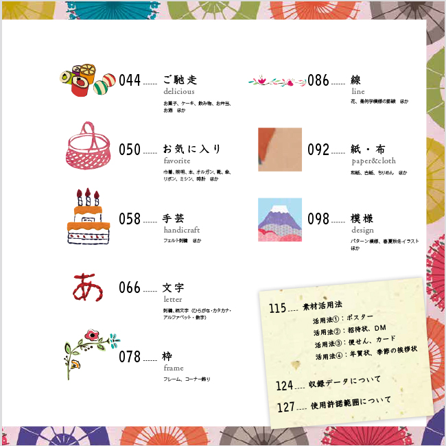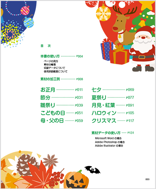 チラシやポスターなどの広告、季節の挨拶状など、季節の行事時の制作物に、少しでも本書の素材が役に立ちましたら幸いです。