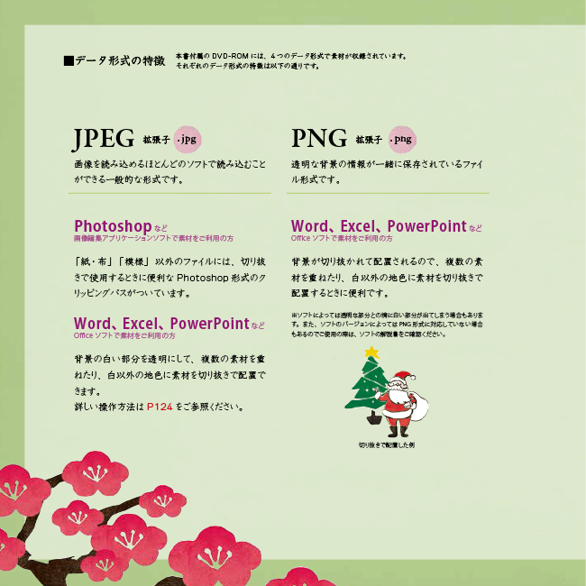 品の良い和素材や、レトロな雰囲気の素材の他、年賀状でも使える、門松、羽子板、12支の動物、富士山などのお正月素材、クリスマスツリーやサンタ、雛人形や七夕飾り、梅や桜や雪など季節を感じることができる素材も満載。年賀状、季節のお便り、結婚式の招待状やポスターなどのオリジナルデザインを楽しむ素材活用例も紹介しています。