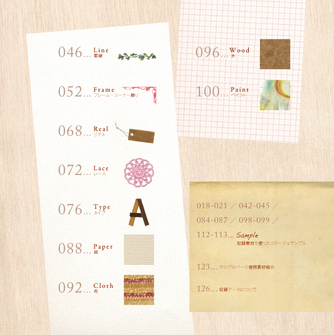 懐かしいけど新しい、小粋でレトロな日本のかわいい素材集。刺繍の文字やフェルトの小鳥、ちょっとくすんだ紙や布。ご褒美に貰った華やかなお菓子、モダンな和柄、アンティークの家具たち…。1点1点、丁寧に作られたこだわりの素材がぎっしりと詰まっています。